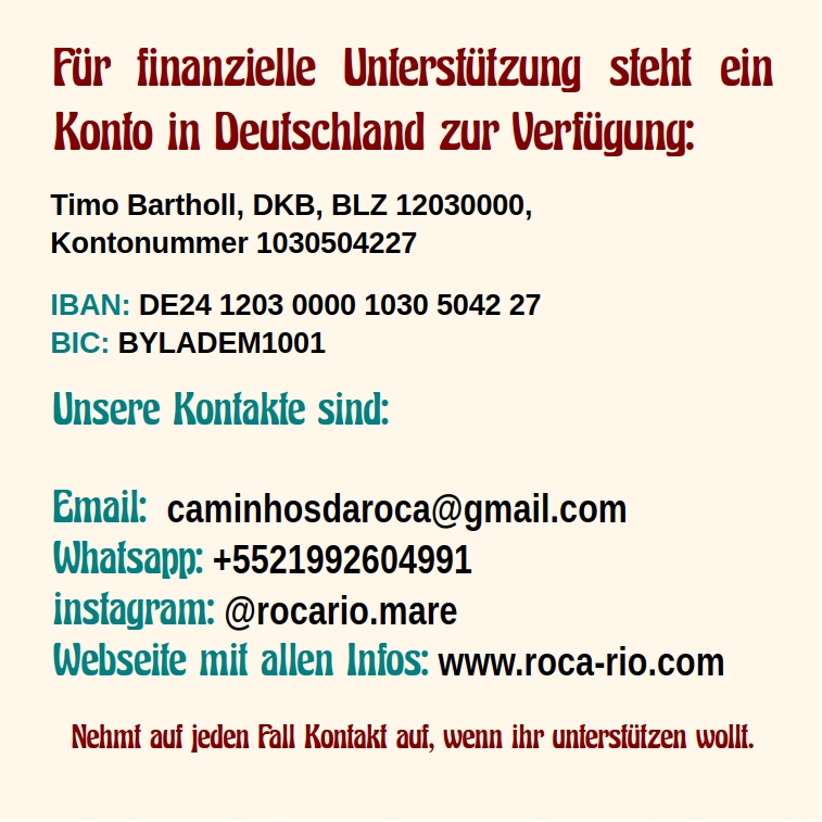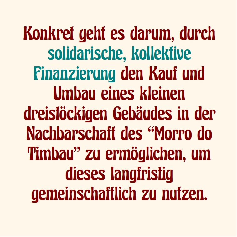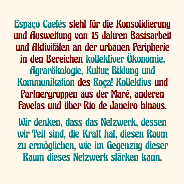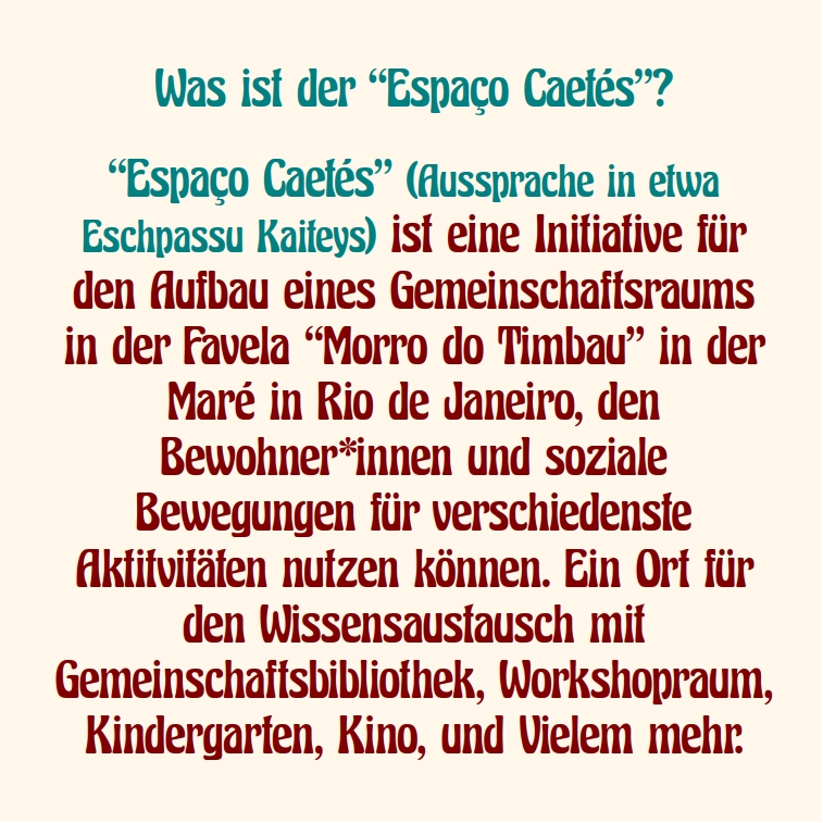 Wir freuen uns zum Jahreswechsel 24/25 eine Kampagne zu starten, die das Ergebnis von 15 Jahren kontinuierlicher Basisarbeit und Lernens ist. Wir laden Euch ein, die Idee zum Gemeinschaftszentrums Espaço Caetés in Morro do Timbau, Maré/Rio de Janeiro, näher kennenzulernen. Können wir es schaffen, diesen Raum zu ermöglichen? Können wir das Netzwerk, zu dem wir gehören, so aktivieren, dass dieser Raum bald uns allen gehört?