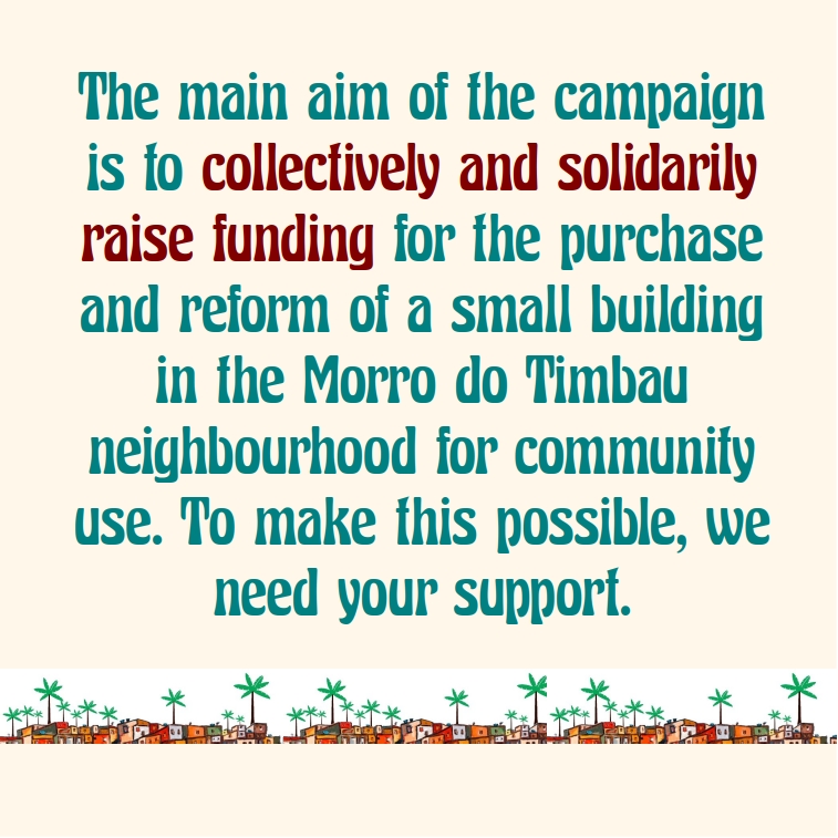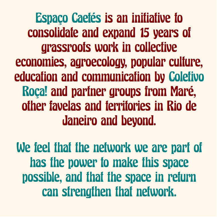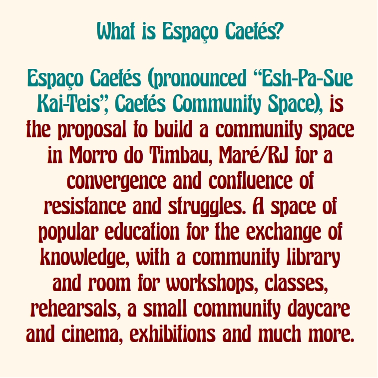 As the new year begins, we’re excited to launch a campaign that is fruit of 15 years of continuous grassroots work and maturing. We’d like to invite everyone to get to know the proposal for Community Space “Espaço Caetés” in Morro do Timbau, Maré/Rio de Janeiro. Will we succeed to make this space real? Will we be able to activate the large network of which we are a part so that the space can be ours, for all of us, very soon? Help spread the word and make it reach more and more people!