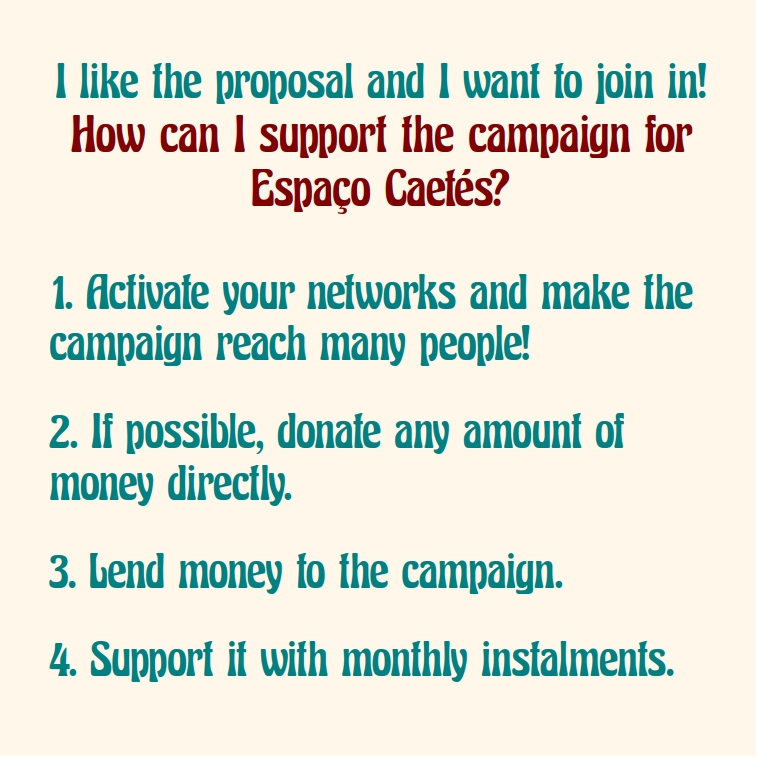 Whether it’s a small amount of 2.00 or 50.00 Reais or dollars or more, the collective effort of our mutual support network will make the difference. Help us publicise the campaign, send out the materials available here or on our instagram, send us a message with any questions, join in anyway possible. Espaço Caetés has come to stay!
