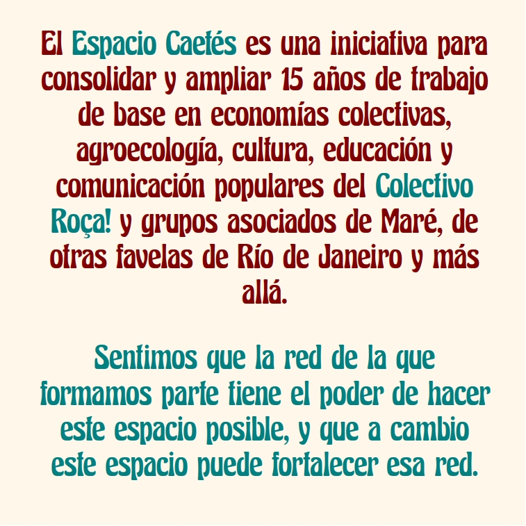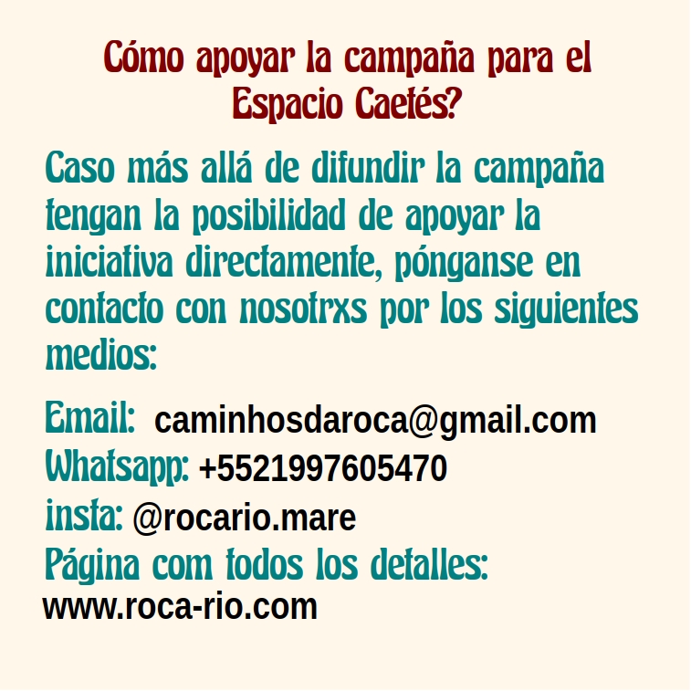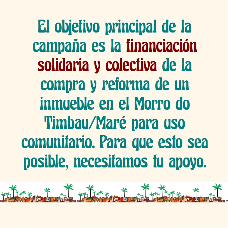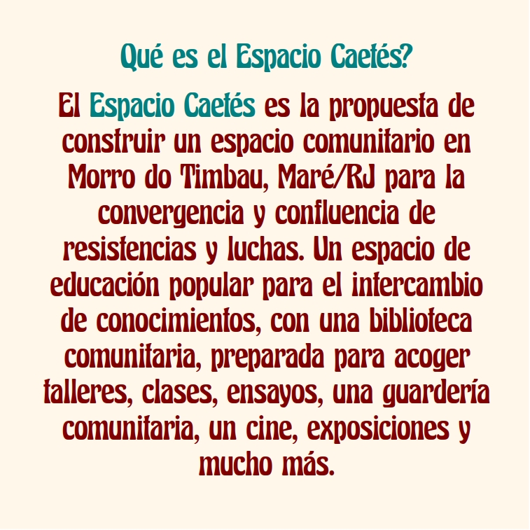 A medida que iniciamos el nuevo año, estamos felices de lanzar una campaña que es fruto de 15 años de trabajo continuo y de mucha maduración. Queremos invitar a todxs a conocer la propuesta del Espaço Caetés en Morro do Timbau, Maré/Río de Janeiro. ¿Conseguiremos construir este espacio? ¿Seremos capaces de activar la gran red de la que formamos parte para que el espacio pueda ser nuestro, de todxs, muy pronto? ¡Ayuda a correr la voz y haz que llegue a más y más gente! ¡Tamo juntxs!