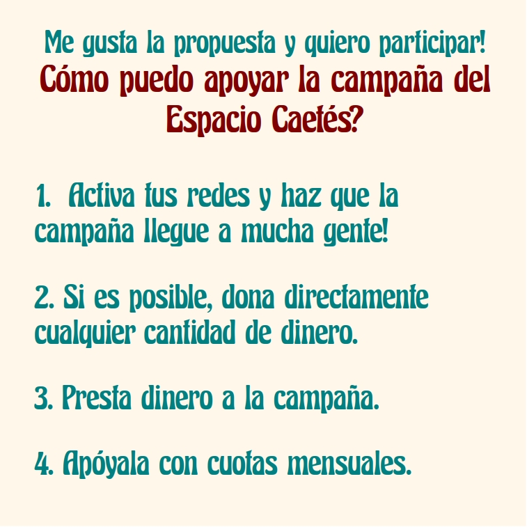 Ya sea una pequeña cantidad de R$2,00 o R$50,00 o más, el esfuerzo colectivo de nuestra red de apoyo mutuo marcará la diferencia. Ayúdanos a difundir la campaña, difunda los materiales disponibles aquí o en nuestro insta, envíanos un mensaje con cualquier pregunta, acompáñanos. ¡Espaço Caetés está aquí para sumar y para quedarse!